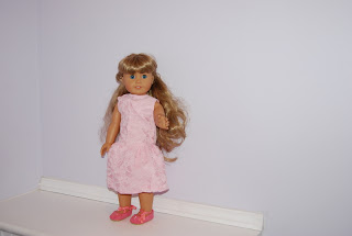 There's also a red store t-shirt with the American Girl logo. It looks really cute with the pink skort, the white Capri jeans or the blue jeans (all store exclusive items, too).